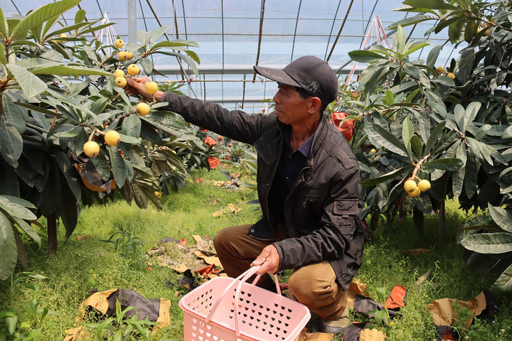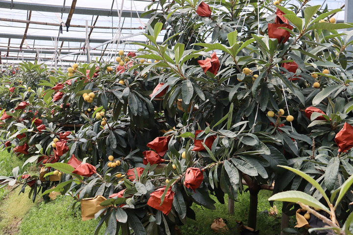 谈及这批枇杷树,王明友有讲不完的感恩。他说,他现在60多岁了,以前一直是在外地种西瓜的,直到7年前在偶然机会下才回到老家转行种“白沙”枇杷。“那时候我在浙江省农科院的支持下,扩大了枇杷种植规模,后来一次偶然机会来到云南参加枇杷类的农技学习,接触到了‘三月白’。刚好当时这边的大棚有几处因台风而导致棚内的枇杷树受伤了,我就把‘三月白’给引进种植起来了。”王明友说。 但令王明友没想到的是,这种移栽过来的“三月白”竟然非常适合温岭这边的土壤环境,加上他精心用现代技术设备进行呵护,头一次结果时,就实现了大丰收。即便是到了今年,每株枇杷树结果量少的有30斤左右,多的有40斤左右,每颗枇杷基本上保持在50到80克。 王明友所使用的现代技术设备,主要有两个,一个是暖风机,另一个是补光灯。暖风机可以根据环境温度自动调节,就像暖宝宝一样保持枇杷树根、土壤表层的温度;补光灯则在阴雨天气时启用,让枇杷树顶部始终温暖如春,使枇杷有周期性地保持光照营养。此外,还通过物联网技术,实现水肥一体化控湿控肥。