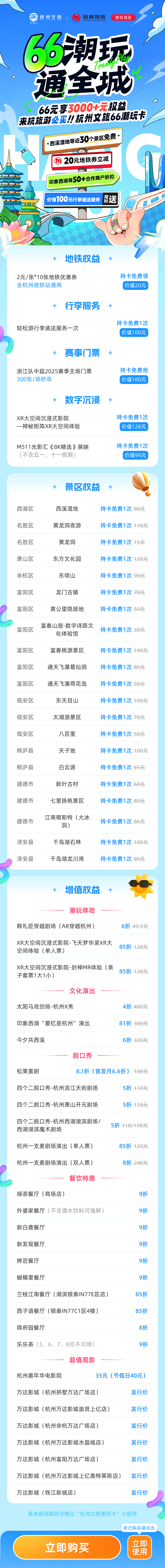 发表时间:2025-03-24 15:11 来杭州旅游,怎么玩最划算、最方便? 为激发城市消费新动能,让全球游客尽享便利,今天(3月24日)杭州市文化广电旅游局推出了一张“旅游+”城市会员卡——“杭州文旅66潮玩卡”。游客只需以66元的超低价格,即可解锁价值超3000元的文旅大礼包! 这张潮玩卡融合了景点、交通、演出、数字沉浸、体育、餐饮、购物等多种城市潮玩业态。有了这张卡,不仅可以免费畅游西溪湿地、黄龙洞、富春桃源等近30个热门景点,体验M511等数字沉浸式演出,享受20元地铁优惠、100元行李递送服务,还可以0元秒杀浙江队中超足球门票,轻松玩转杭州。 潮玩卡具体有哪些功能? 潮玩卡主要包含景点、演出、交通等方面的优惠。 在旅游方面,持卡即可享受近30个杭城必游地标景点免门票一次,包括西溪湿地、黄龙洞、龙门古镇、千岛湖石林等,还有M511光影汇8K影院、神秘矩阵XR大空间等数字沉浸场景 。也就是说,7天内这些好看好玩的地点可一卡通行。另外,还可以0元秒杀浙江队中超赛事席位。 在交通方面,持卡立享7天内杭州地铁20元(10张抵扣券,每张2元)立减优惠,坐地铁游杭州,无缝接驳绿色出行;在杭州东站轻松游服务点,凭卡可享价值100元行李寄存/递送专项服务,1分钟甩掉行李,让“轻装畅游”从下高铁即刻实现,打造“零负担”深度游体验。 在消费方面,持卡可享受湖滨IN77打卡网红餐饮5折起,工联CC解锁超值观影套餐,在潮玩空间体验数字艺术特展……50余家核心商圈商户专属优惠全域覆盖,形成“上午游西湖、中午品杭食、下午逛展览、夜间赏演出”的一站式消费链,购卡即享一年的“杭州城市会员”资格。 潮玩卡怎么买? 支付宝搜索“杭州66卡”,1分钟完成购卡激活,2小时极速生效。游客可持“杭州文旅66潮玩卡”二维码、CityPass一码通、刷身份证等多种方式畅游杭州,50+商圈特惠权益365天持续放送。通过动态权益更新系统,让一卡持续解锁城市新玩法,实现“四季畅游不重样”。 “我们希望这张潮玩卡不仅是游客的‘省钱神器’,更是城市消费的‘活力引擎’。”杭州市文化广电旅游局旅游经济实验室相关负责人介绍,潮玩卡预计通过跨领域资源整合实现三重效应:一是降低消费门槛和旅游便利度,提升市民游客出游意愿;二是通过串联起“游、行、食、购、娱”五大旅游消费场景促进消费延伸,预计将带动景区周边餐饮、住宿、购物等二次消费;三是培育新型消费,通过嵌入数字文旅体验等沉浸式业态,带动市民游客探索新杭州。 该负责人表示,未来潮玩卡还将根据市场反馈动态调整优惠策略,逐步扩大该卡在乡村文旅、体育休闲等领域的应用场景,持续释放文旅消费“乘数效应”。