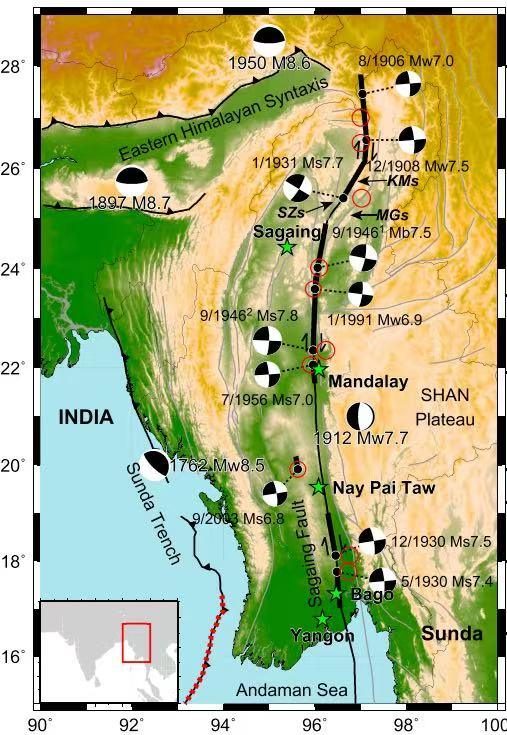 缅甸地震图示。图片来源:浙江省地震局官微 中国地震学会科学普及委员会委员王晓民告诉潮新闻记者,缅甸地块地震多发的主要原因在于构造运动强烈,印度板块与欧亚大陆不断碰撞,为地震源源不断地提供动力,缅甸位于这个碰撞系统的东端,断裂带发育充分,既有地块西段被印度板块俯冲发育的逆冲断裂,也有中部超大规模地走滑断裂。 “它的每年平均滑动速率达到近2厘米,这是一个非常惊人的数据,也就意味着100多年就能积累起数米尺度的滑动亏损,我们知道地震震级越大产生的断层滑动量也越大,数米的滑动量是大地震才具有的滑动特征。”王晓民说。 1900年以来,此次震中附近300公里范围内共发生7级以上地震10次,最大为1912年5月23日缅甸境内的8.0级地震。 王晓民称,大地震撕裂地壳,会造成区域应力场的调整,影响后续地震的发生。这次7.9级地震对地下应力场的影响会持续一段时间,一段时期内附近区域的地震频率可能增强,特别是这次地震破裂区域的南段,要关注到由于应力加载引起地震连锁反应的可能性,值得当地政府与人民注意。 (潮新闻)