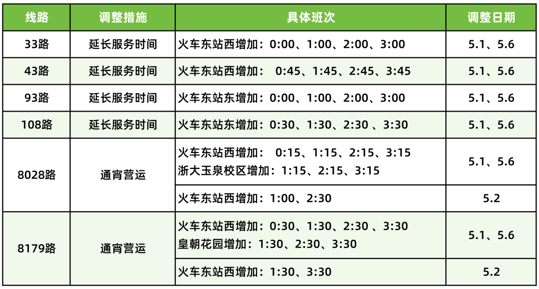 受访者供图 针对其他铁路枢纽站的客流实际情况,杭州公交同步调整杭州火车东站等站点常规线路班次:5月1日、6日凌晨临时延长33、43、93、108路服务时间;5月1日、2日、6日调整夜间线路8028、8179路为通宵运营,并在杭州西站、杭州南站推出“点对点”团体定制专线,覆盖浙江大学、未来科技城等高校与产业园区。
