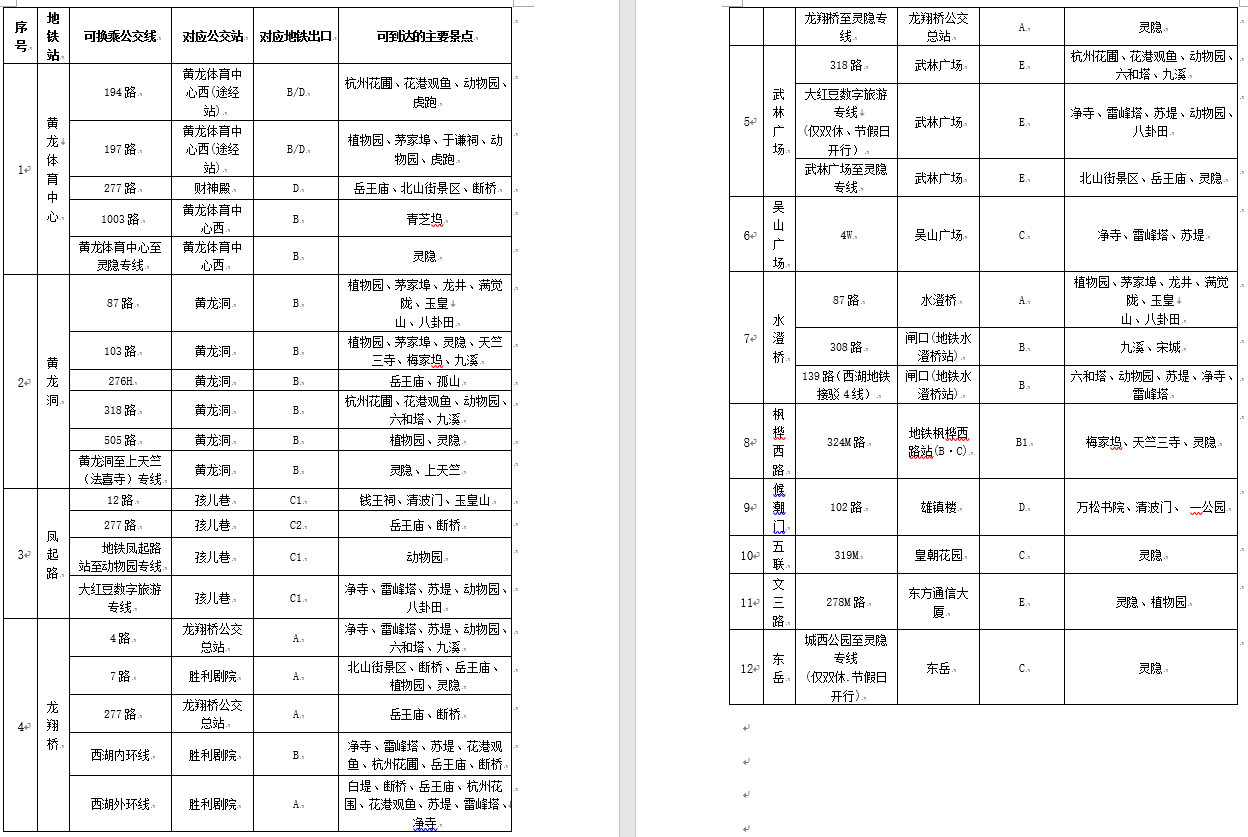 此外,备受好评的“公交一日票/二日票”也将继续上线,一日票售价8.8元,二日票售价15.8元。 乘客购买日票后可在规定时间内无限次乘坐常规线路。 今年五一,杭州公交将继续强化“地铁+公交”模式,在距离西湖景区最近的12个地铁站设置公交接驳专线,实现地铁与公交“零距离”换乘。 同时,针对旅游大巴接驳需求,在西湖外围设置将台山、梵村等4个接驳始发点,景区内部设置玉皇山、苏堤南口等9个停靠点。 此外,持续开放城西公园、黄龙体育中心等小车换乘点,加密西溪路608号、马家坞等区域网约车接驳线班次。 西湖景区周边地铁站“地铁+公交”换乘线路一览表