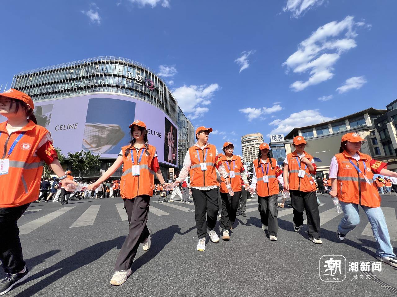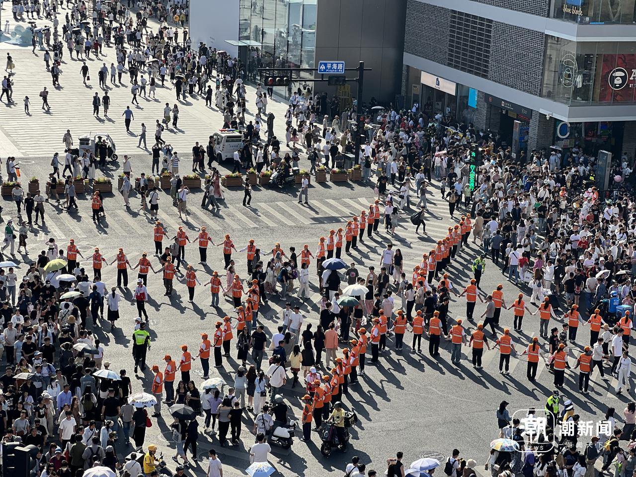 最美人墙。谢春晖/摄 领队沈廷冲沿着路口走动,指挥队形:“有的志愿者是第一次参与,我要让他们快速掌握队形的变化规律。”
