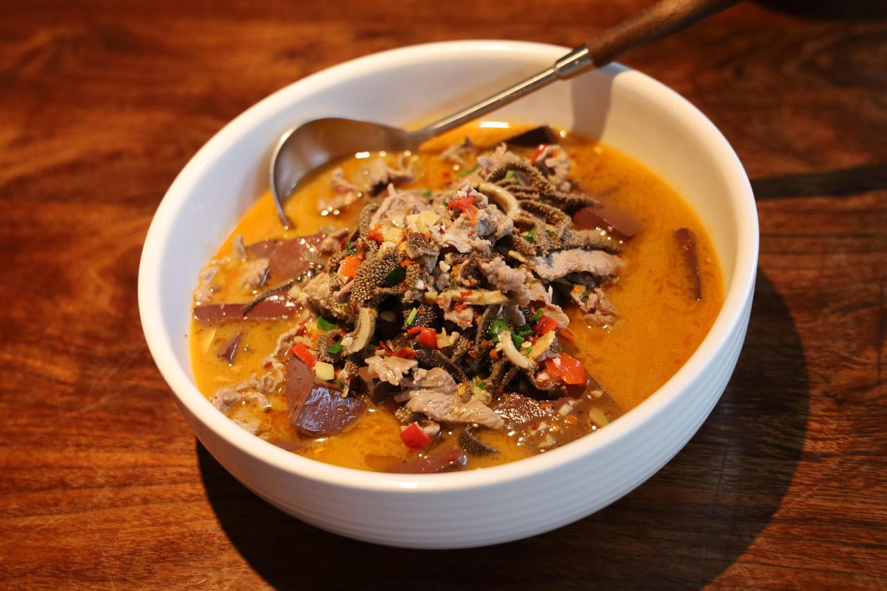 受访者供图 这原本是栋烂尾楼,项目主理人、中国美院2006届毕业生肖君把外立面改成白色,二三层采用外撑的遮阳棚,天气好的时候,伸出手就能感受到流动的光线。 在这个艺术社区,“山胡椒”店主倩司秉持“生活即是艺术”的理念,打造出一家独具特色的湘菜餐厅。斑驳的绿椅带着岁月的痕迹,暖黄色的灯光映照出温馨的氛围。 “我们地方菜和大家印象中的湘菜不一样,很多菜里会放一味叫‘山胡椒油’的调料,吃起来是清凉的。”身为湖南娄底人的倩司从小就爱吃家乡菜,做饭好吃的妈妈来杭后,经常招待朋友们来吃,“大家都很喜欢这些菜,后来就想到了开一家餐馆,厨师都是从老家叫来的。” 从“家庭作坊”到如今的“山胡椒”,倩司把“家”搬到了一个更大的空间,店里很多桌椅都是从中古店淘来的,就为了家的感觉。开放式厨房的设计延续了“家”的风格,厨师做菜的过程一览无余,食客就像坐在自己家的厨房。 牛血焯水捞出,热油下辣椒、蒜等调料,再将牛血回锅,滴入山胡椒油、白醋增香,后捞出牛血垫盘,再将牛肉和牛百叶下入锅中猛火爆炒,做了二十多年湘菜的廖师傅正麻利地处理着食材。不一会儿,一道香喷喷的特色菜三合汤就出锅了。端上桌,菜色漂亮,香味弥漫。山胡椒油的作用下,肉的香味已被彻底激发出来,令人食指大动。