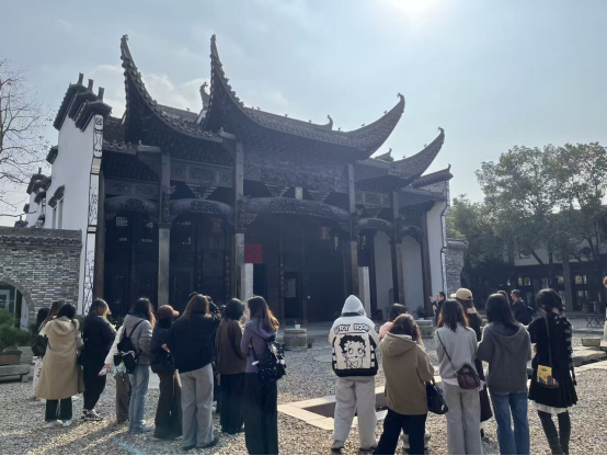 跨界融合破局 创新思维觉醒 扶摇里中医文化健康生活产业园的跨界转型,给参与调研的学生带来了新的启发。这个由老旧茶厂改造而来的文化产业园,将乡村产业升级、经济模式转型、传统文化振兴等功能融为一体,其不拘一格的融合发展理念,为面临就业焦虑、对专业市场需求存疑的学生提供了新思路。学生们意识到,在复杂的市场环境下,唯有打破专业边界、实现跨界融合,才能找到自身专业价值的发光点。 调研过程中,学生们也发现了“跨界融合” 的创新魅力:在扶摇里产业园,中医不再局限于医疗领域,而是成为串联农业、养生、文创、生态的文化枢纽;国乐队的现场演奏,打破了听觉艺术与视觉艺术的壁垒,为导视设计赋予了动感与节奏感;杭州建达标识系统工程公司早已突破视觉设计边界,转型为集视觉设计、雕塑创作、品牌管理于一体的一站式服务商;青山融设计图书馆更是将乡村废弃大礼堂改造成顶尖设计殿堂,展现了融合设计的无限可能。这些案例让学生们对 “设计服务城乡建设、设计助力经济发展” 有了全新认知。
